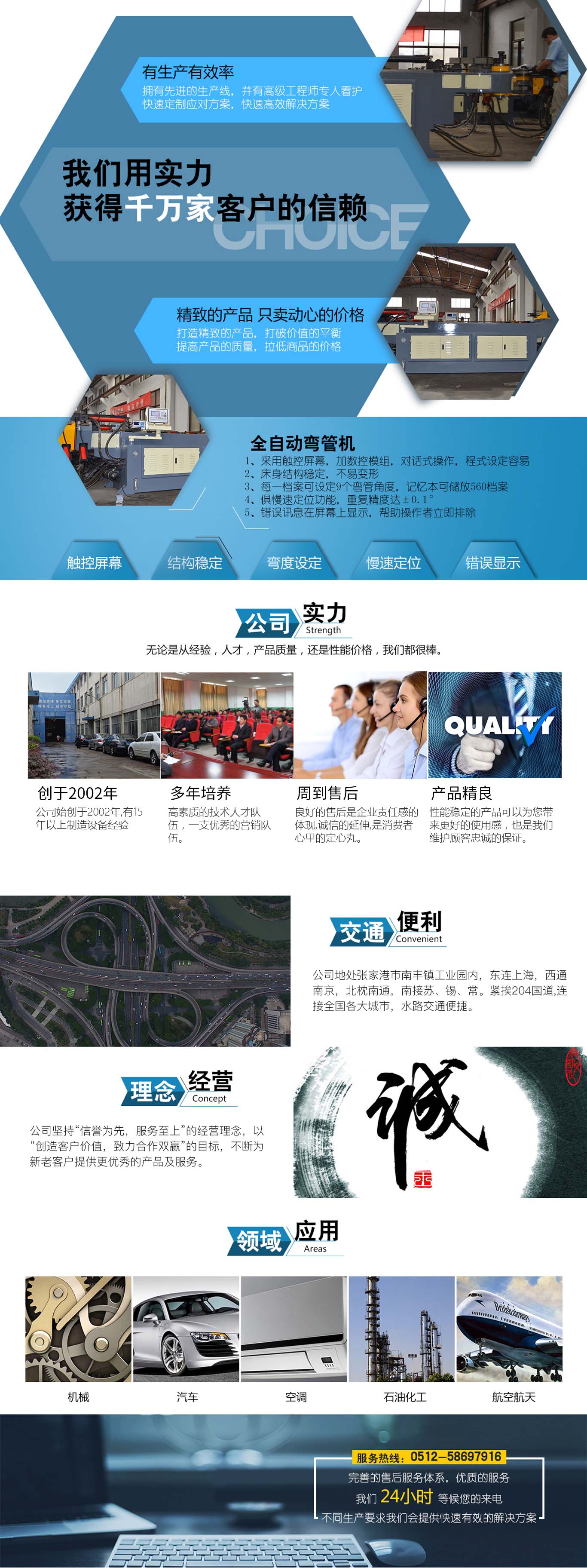 張家港市雙和機械制造有限公司始建于2001年,占地面積12000平方米,南鄰蘇州、無錫、上海,東鄰常州、南京,交通便利,位長三角中間地段,風景優(yōu)美的張家港。 雙和公司至創(chuàng)立開始,引進了國外的設計制造理念,組建了企業(yè)生產管理優(yōu)秀團隊,致力于管材加工機械研發(fā)、設計、制造。創(chuàng)新的設計理念,嚴格的質量把關,專業(yè)的售后服務,不斷提升了我在整個行業(yè)的影響力。 雙和公司生產的系列產品分為彎管機、切管機、縮管機、磨齒機、伺服彎管機、數控彎管機、液壓彎管機、自動切管機、管端成型機、倒角機、大弧滾圓機、鋁切機、壓彎機等管材加工機械,廣泛用于航天業(yè)、造船業(yè)、汽車制造、鍋爐制造、自行車、摩托車、體育健身器材、管制品家...